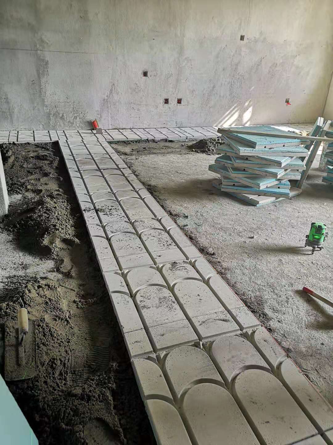 電地暖? ? ? ? ?裝配式架空保溫隔聲板施工技術(shù),在架空承重五腳型鋼筋混凝土板背面噴涂發(fā)泡聚氨酯或噴涂無機礦物纖維保溫隔聲材料層,在現(xiàn)場制作快硬水泥砂漿支腳墊塊找平層,支腳層用橡膠減振墊粘帖。