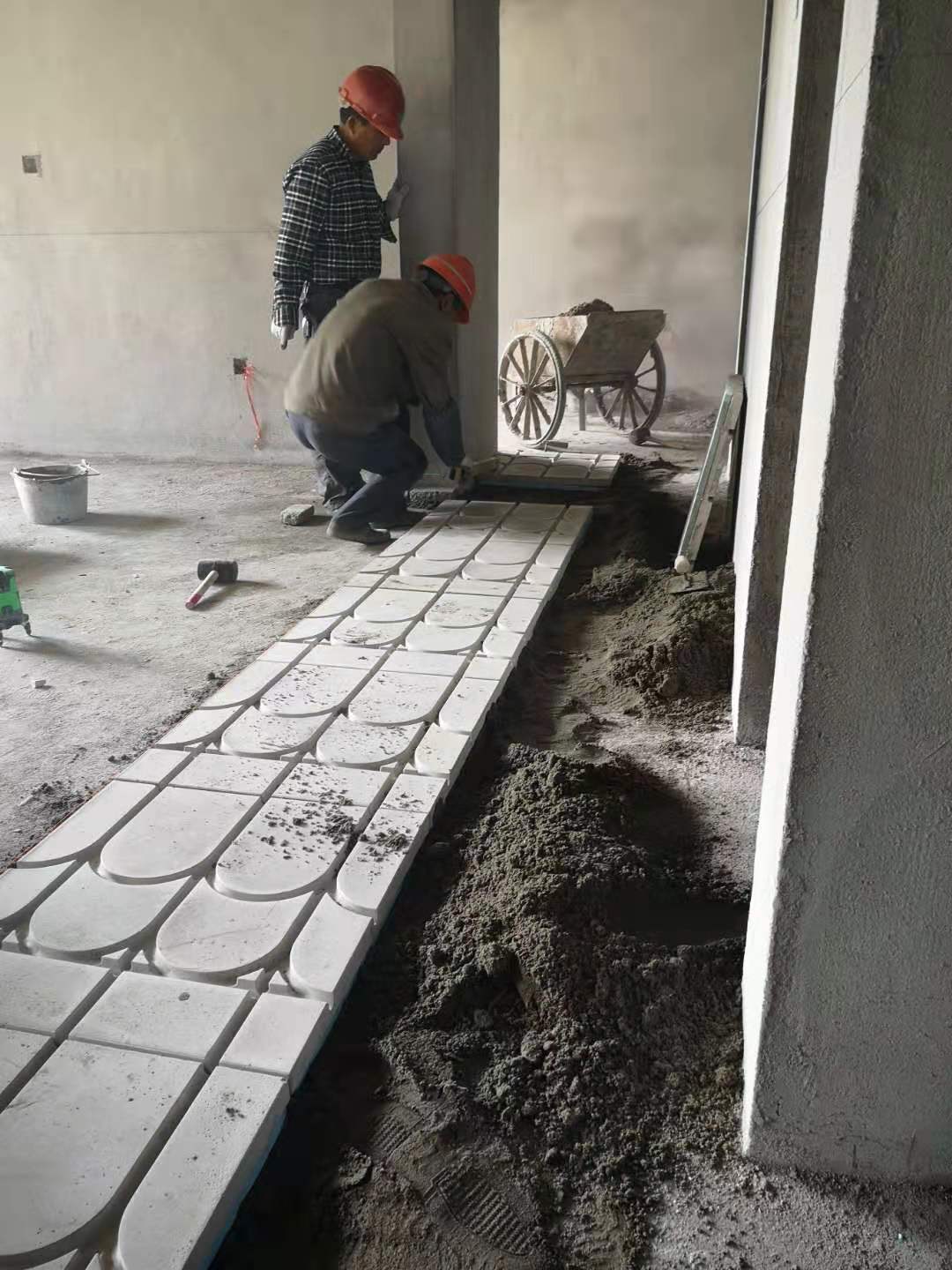 水地暖? ? ? ? 裝配式架空保溫隔聲板施工技術(shù),在架空承重五腳型鋼筋混凝土板背面噴涂發(fā)泡聚氨酯或噴涂無機礦物纖維保溫隔聲材料層,在現(xiàn)場制作快硬水泥砂漿支腳墊塊找平層,支腳層用橡膠減振墊粘帖。墻四周邊預(yù)留
